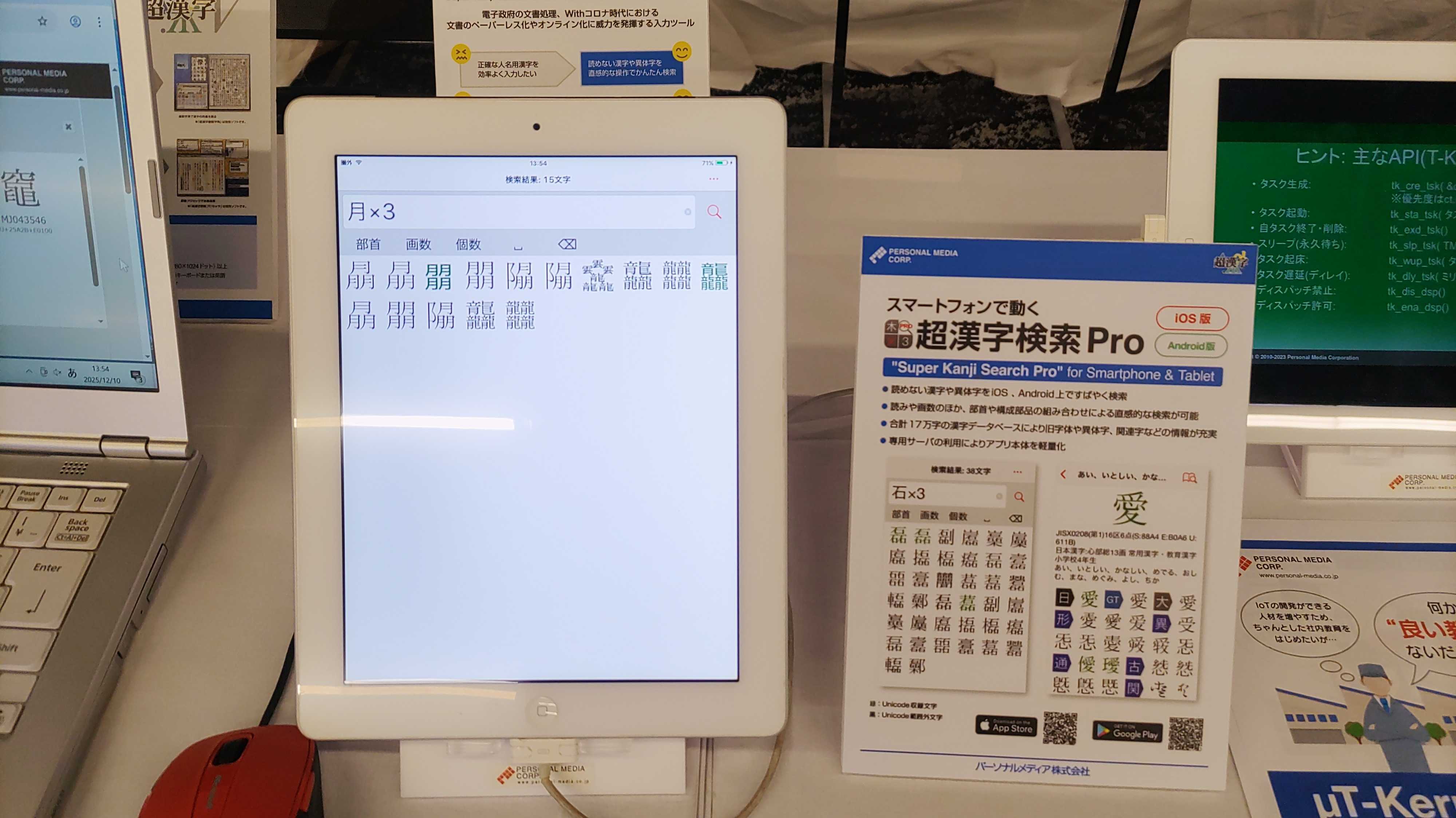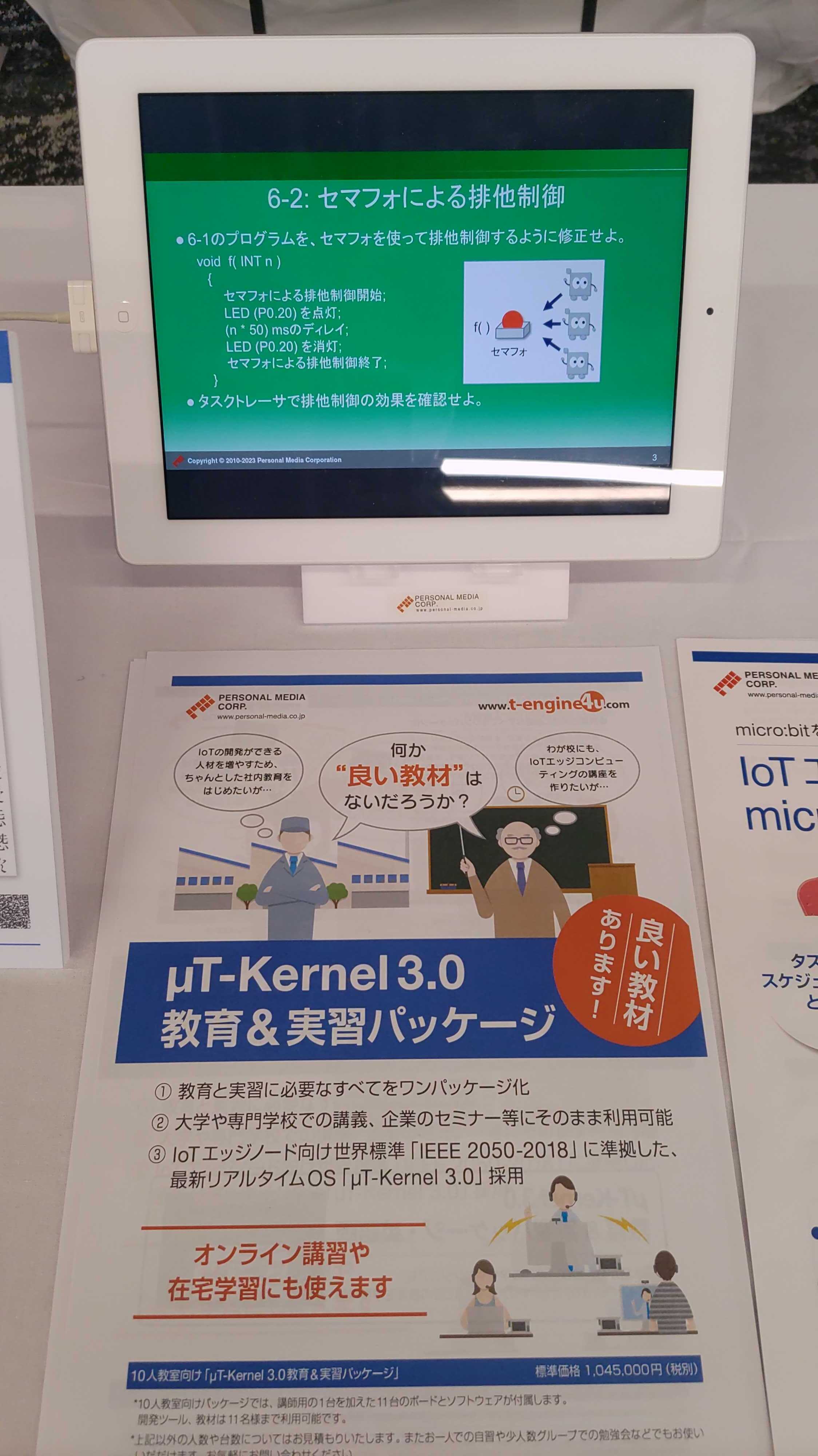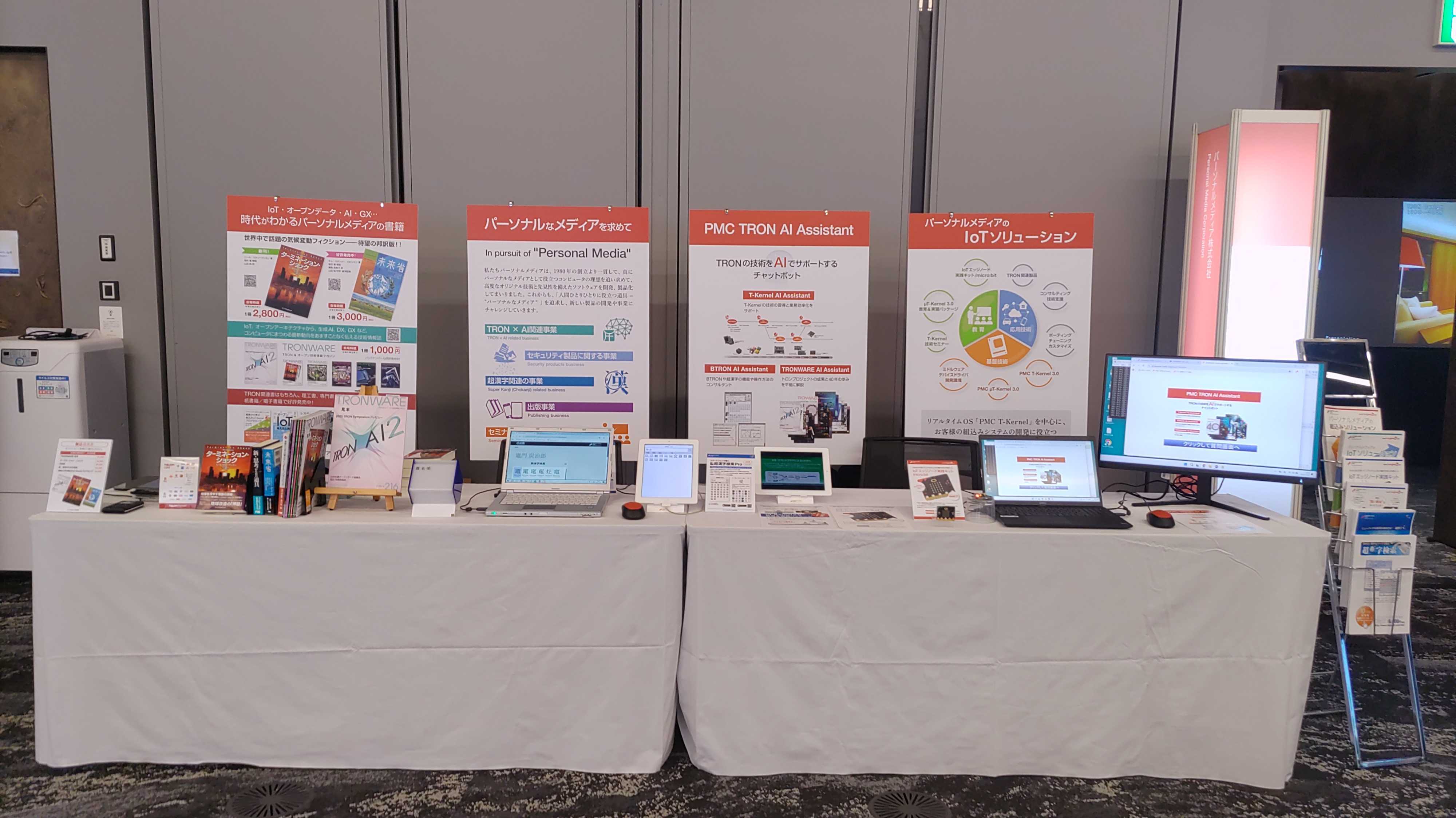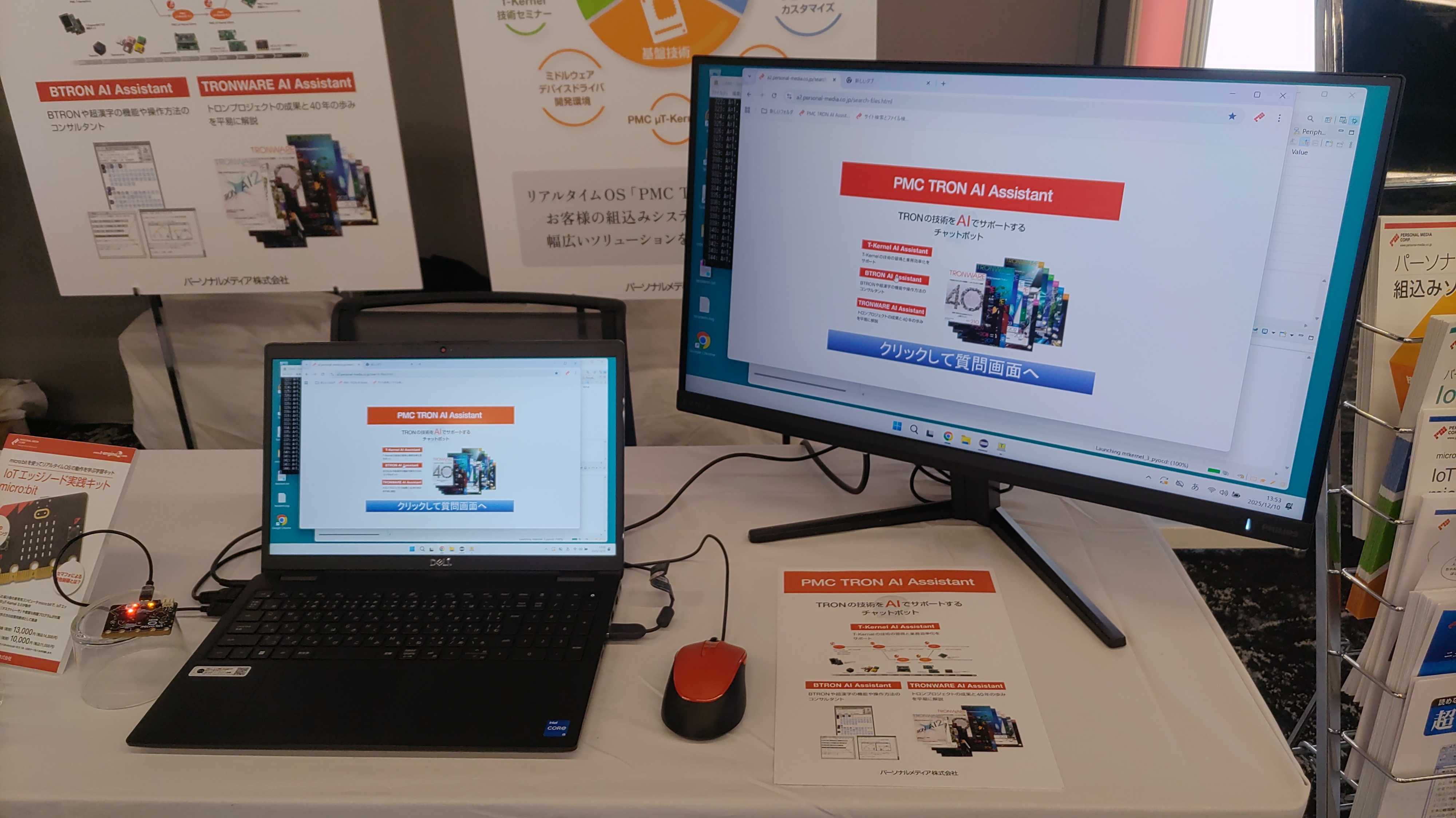 当社ブース(ブースNO: A-4)では、TRONの技術をAIでサポートするチャットボット「PMC TRON AI Assistant」の最新版、マルチコア対応の最新版組込み向けリアルタイムOS「PMC T-Kernel 3.0」、μT-Kernel 3.0とmicro:bitを使ったリアルタイムOSの学習教材「IoTエッジノード実践キット/micro:bit」、昨年に発売25周年を迎えたパソコン用BTRON「超漢字」など、当社のTRON関連ソリューションを紹介しました。