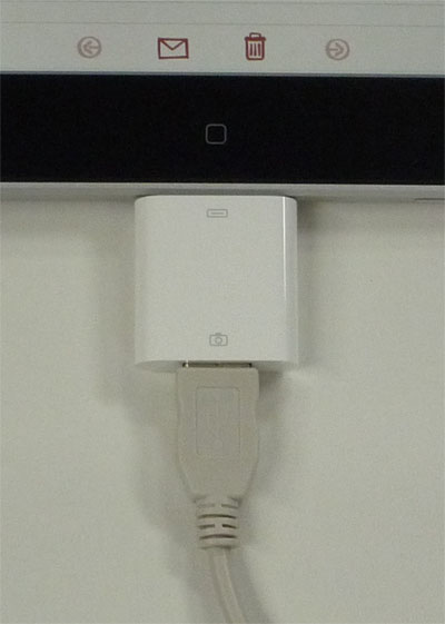接続には、別売の「iPad カメラ接続キット」中のカメラコネクタのアダプタが必要です。